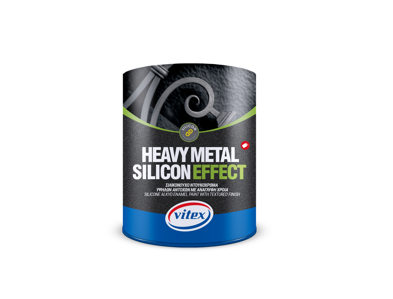 Silikonski čvrsti teksturni emajl vrhunskog kvaliteta na bazi rast¬varača pogodan za unutrašnje i spoljne metalne površine. Ova ver¬zija Heavy Metal Silicon sadrži visok procenat granula liskunastog oksida gvožđa, koja pored specijalne dekorativne teksture obojenoj površini obezbeđuje plišani metalik efekat i satenski izgled, obez¬beđujući u isto vreme odličnu antikorozivnu zaštitu i otpornost na UV zračenje. Takođe se može nanositi na drvo.