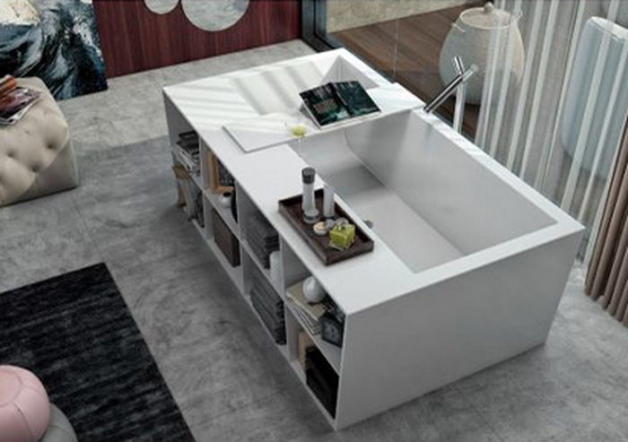 Samostojeća kada za kupanje od Kerrock materijala sa policama i policom za odlaganje za kadu sa odlivnom garniturom i Up&Down sistemom te automatskim prelivom.